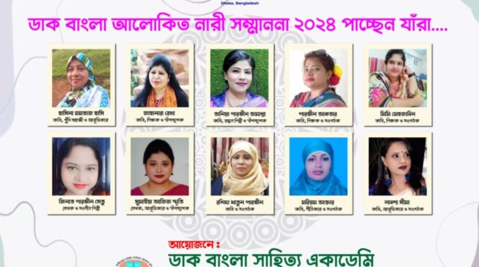 ডাক বাংলা সাহিত্য একাডেমি কর্তৃক আয়োজিত ‘ডাক বাংলা আলোকিত নারী সম্মাননা ২০২৪’ প্রদানের জন্য সমাজকল্যাণ ও মানবকল্যাণমূলক কর্মকাণ্ডে বিশেষ অবদানের স্বীকৃতি স্বরূপ ১০ জন নারী পাচ্ছেন ‘ডাক বাংলা আলোকিত নারী সম্মাননা ২০২৪’। গত ২৭ অক্টোবর ২০২৪ খ্রি. রোজ রবিবার বিকাল ৪ ঘটিকায় একাডেমির কেন্দ্রীয় কার্যালয়ে অনুষ্ঠিত ‘ডাক বাংলা আলোকিত নারী সম্মাননা ২০২৪’ কমিটি মনোনীত জুরি বোর্ডের সভায় এই সিদ্ধান্ত নেওয়া হয়েছে। উক্ত সম্মাননা প্রদানের স্থান, তারিখ ও সময় পরবর্তী সময়ে জানিয়ে দেওয়া হবে।