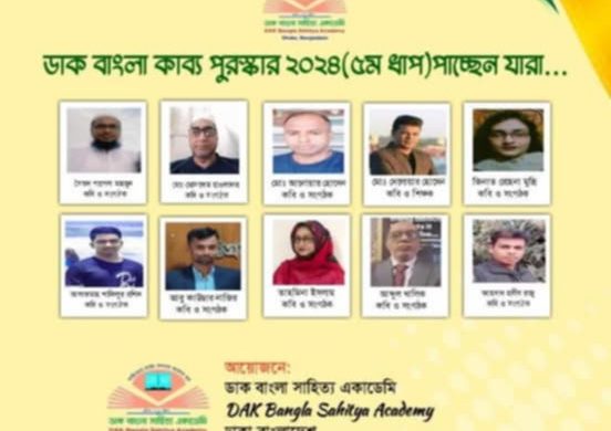 ডাক বাংলা সাহিত্য একাডেমি কর্তৃক আয়োজিত ‘ডাক বাংলা কাব্য পুরস্কার ২০২৪ (৫ম ধাপ)’ প্রদানের জন্য কাব্য সাহিত্যে বিশেষ অবদানের স্বীকৃতিস্বরূপ ১০ জন পাচ্ছেন ‘ডাক বাংলা কাব্য পুরস্কার ২০২৪ (৫ম ধাপ)’। গত ১২ ডিসেম্বর ২০২৪ খ্রি. রোজ বৃহস্পতিবার বিকাল ০৪:০০ ঘটিকায় একাডেমির কেন্দ্রীয় কার্যালয়ে অনুষ্ঠিত ‘ডাক বাংলা কাব্য পুরস্কার ২০২৪ (৫ম ধাপ)’ কমিটি মনোনীত জুরি বোর্ডের সভায় এই সিদ্ধান্ত নেওয়া হয়েছে। পুরস্কার প্রদানের স্থান, তারিখ ও সময়সূচি অনুযায়ী পরবর্তী সময়ে জানিয়ে দেওয়া হবে।