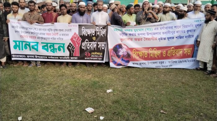 মহানবী হযরত মুহম্মাদ (সাঃ) এর নামে কটুক্তি মূলক বক্তব্য দেওয়ায় রূপসা উপজেলার ভবানিপুর গ্রামের অন্তর বৈরাগী ও ভারতের রামগিরি মহারাজ এর দৃষ্টান্তমূলক শাস্তির দাবীতে মানববন্ধন ও বিক্ষোভ সমাবেশ আজ ২৯ সেপ্টেম্বর বিকালে অনুষ্ঠিত হয়।