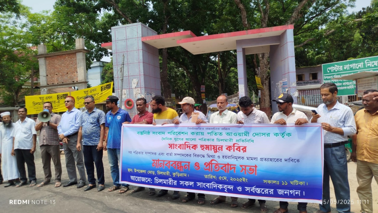 চিলমারীতে সাংবাদিকের বিরুদ্ধে মিথ্যা মামলা প্রত্যাহারের দাবিতে মানববন্ধন