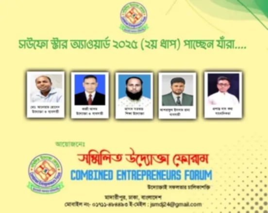 বঙ্গ ডেস্ক : সম্মিলিত উদ্যোক্তা ফোরাম কর্তৃক আয়োজিত 'সউফো স্টার অ্যাওয়ার্ড ২০২৫ (২য় ধাপ)' প্রদানের জন্য উদ্যোক্তা, ব্যবসায়ী ও সাংবাদিকতায় বিশেষ অবদানের স্বীকৃতিস্বরূপ ৫ জন পাচ্ছেন 'সউফো স্টার অ্যাওয়ার্ড ২০২৫ আরও বিস্তারিত!
