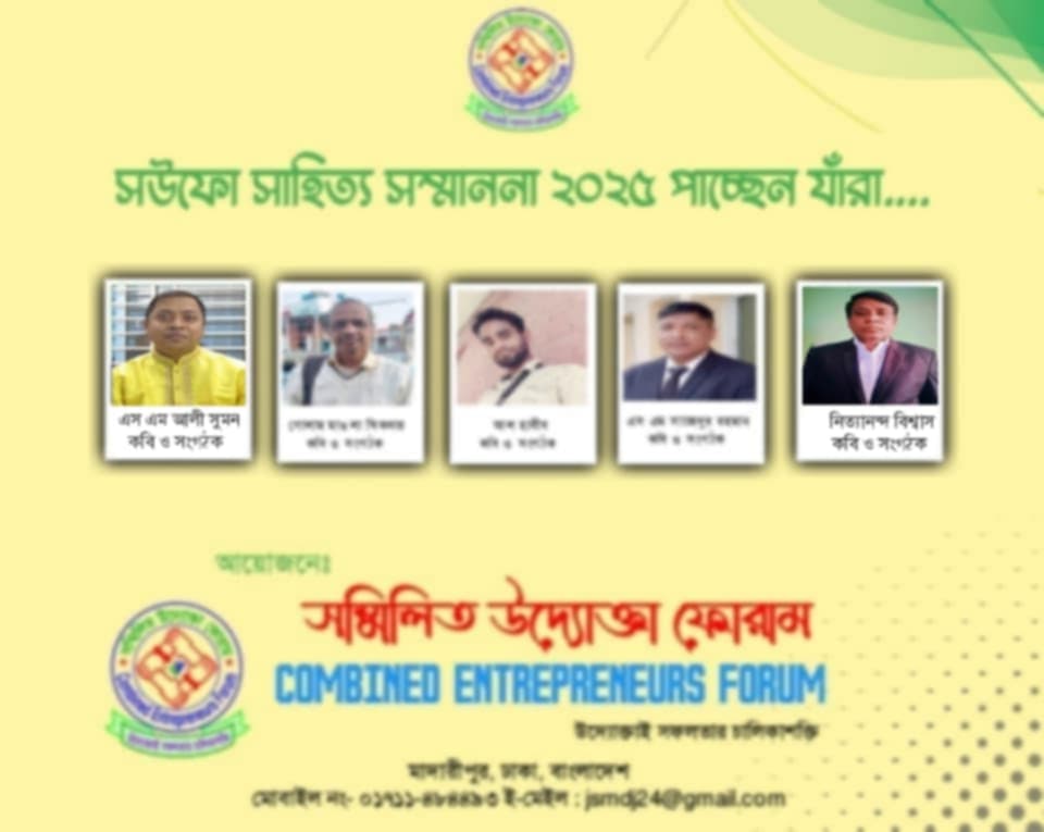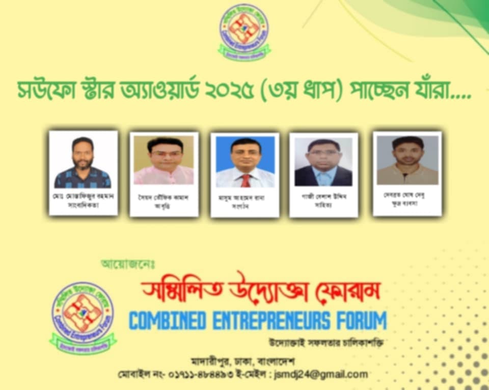 বঙ্গ ডেক্স: সম্মিলিত উদ্যোক্তা ফোরাম কর্তৃক আয়োজিত 'সউফো স্টার অ্যাওয়ার্ড ২০২৫ (৩য় ধাপ)' প্রদানের জন্য সাংবাদিকতা, আবৃত্তি, সংগঠন, সাহিত্য ও ক্ষুদ্র ব্যবসা ক্যাটাগরিতে বিশেষ অবদানের স্বীকৃতিস্বরূপ ৫ জন পাচ্ছেন 'সউফো আরও বিস্তারিত!